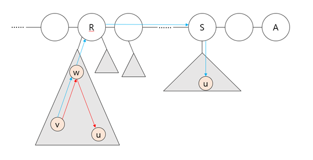 d(v, u)>d(v, A)를 만족하므로, w를 v와 u의 LCA라 했을 때 d(w, u)>d(w, A)이고, d(R, u)-d(R, w)>d(R, w)+d(R, A)이므로, d(R, u)>d(R, A)라는 결론을 얻게 된다. (∵d(R, w)>0) 근데 그렇다면 트리의 지름은 R에서 A로 가는 경로가 아니라 R에서 u로 가는 경로를 포함할 것이므로 모순이다.