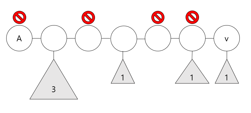 d(v, u)>d(v, A)를 만족하므로, d(v, S)+d(S, u)>d(v, S)+d(S, A)이고, d(S, u)>d(S, A)이다. 그렇다면 트리의 지름은 S에서 A로 가는 경로가 아니라 S에서 u로 가는 경로를 포함할 것이므로 모순이다.